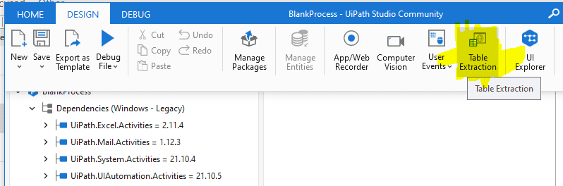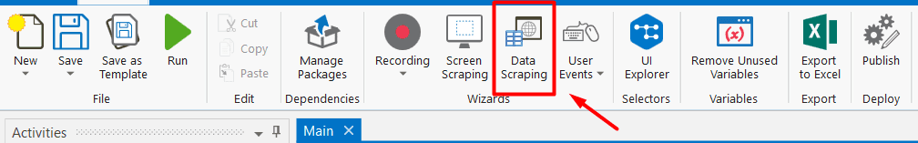 In the UiPath Studio, navigate to the "Design" tab, and click on "Data Scraping". This will open the Data Scraping wizard, which is specifically designed to scrape structured data from web pages.
