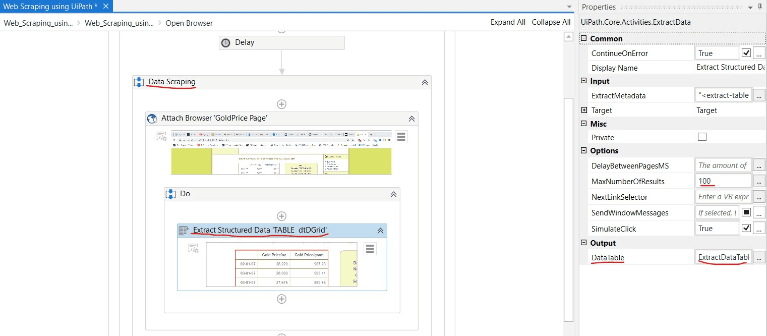 You can now run the project to scrape the data. The extracted data will typically be stored in a DataTable variable, which you can then write to an Excel file, a database, or any other storage mechanism of your choice using the appropriate activities.