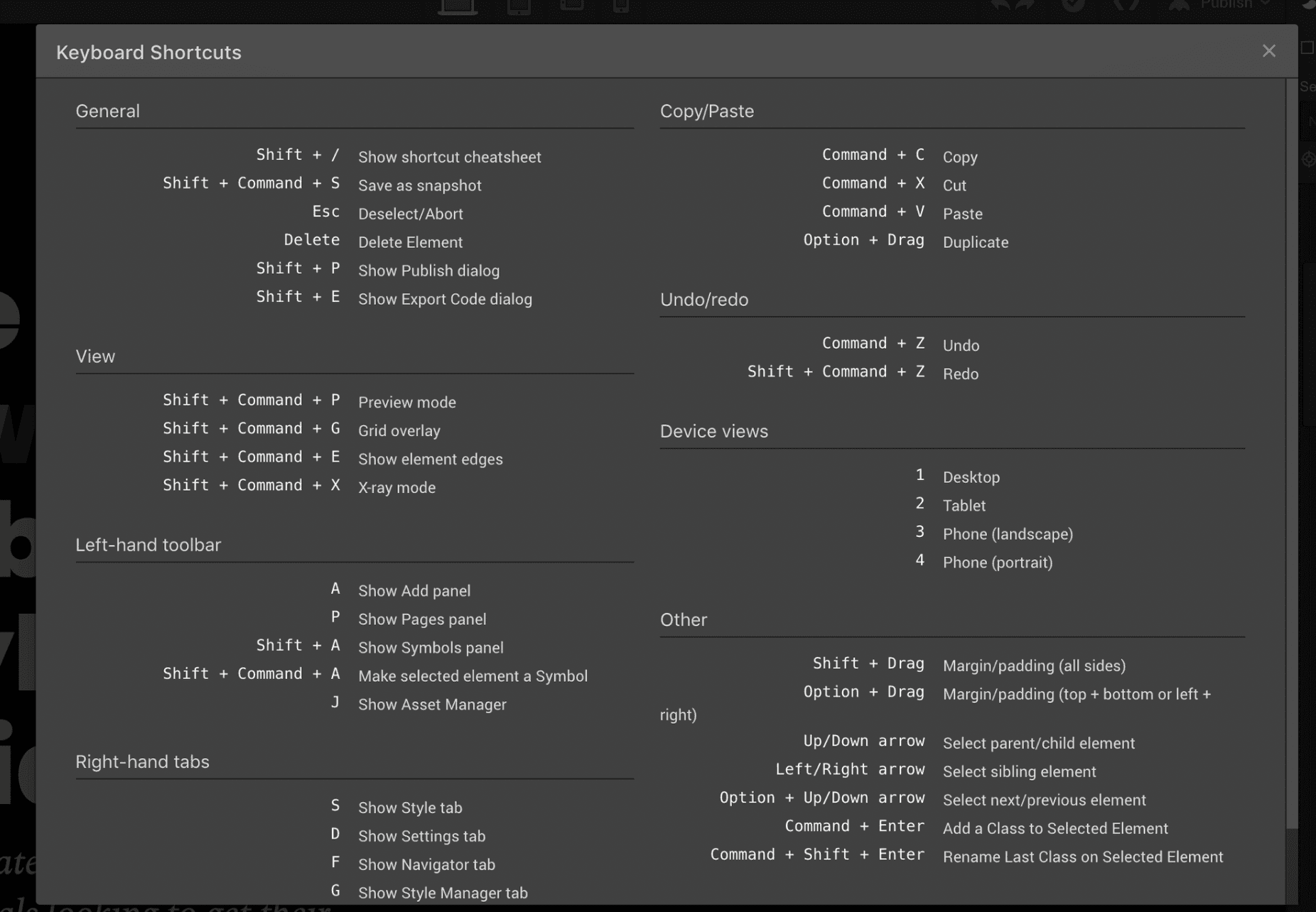 Webflow shortcuts are essentially a series of keyboard commands that help you to speed up your workflow when using Webflow. Instead of relying on your mouse or trackpad for every action, these shortcuts allow you to perform various tasks using quick keystrokes.