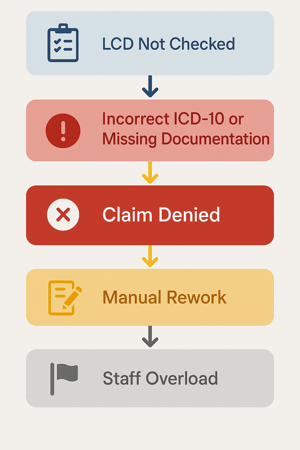Ignoring LCDs doesn’t just affect one-off claims. It can trigger mass denials across categories like: