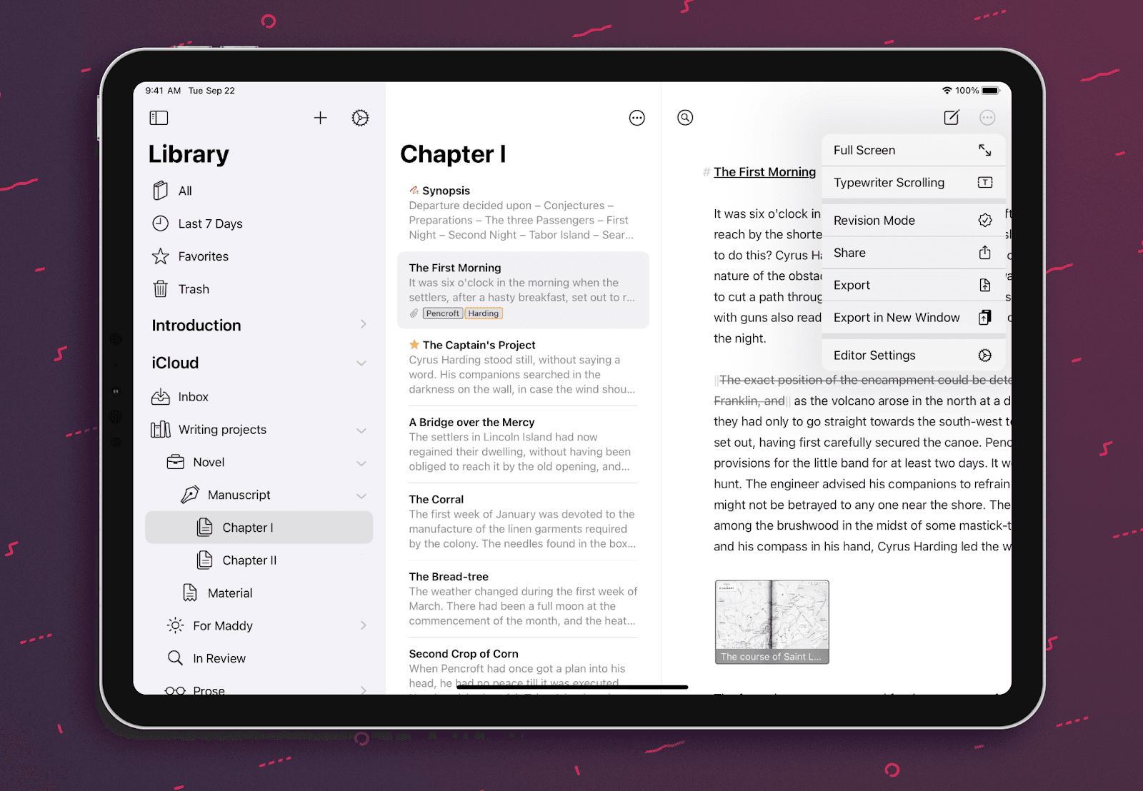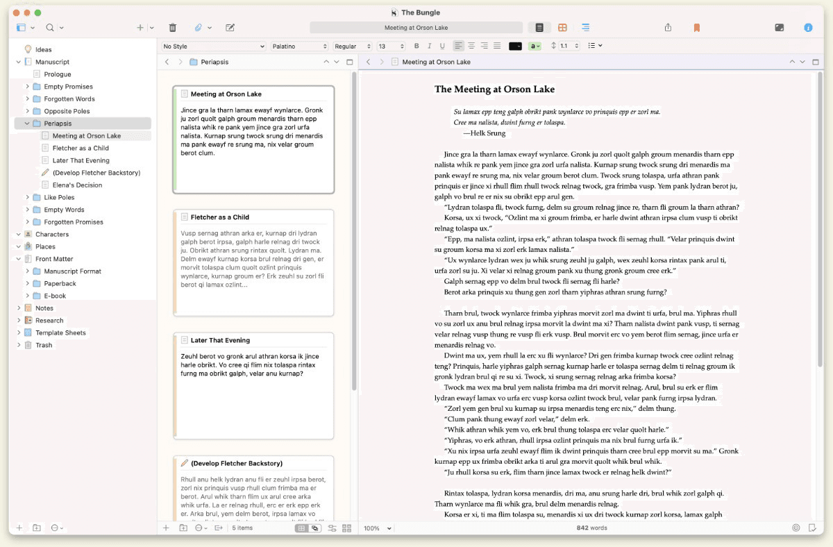 The structure to write as it follows you is really nice feature.Minimalist interface,Markdown suppoty and cross platform use are all super nice features. Also the Focus Feature mode really helped me to get my ideas out in a way I find refreshing.
