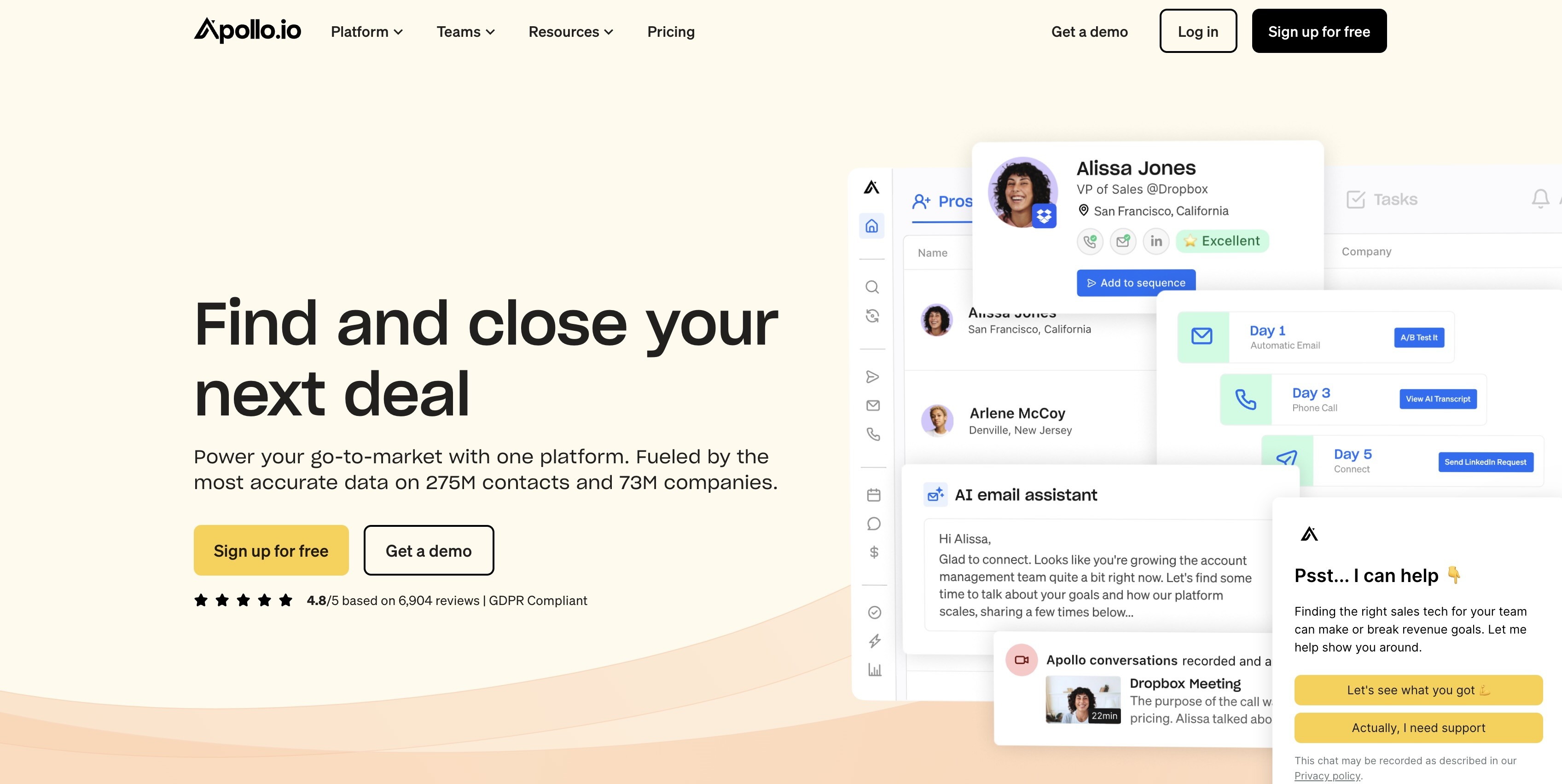 Next up, we've got Apollo.io. This sales intelligence platform is all about helping you engage with the right prospects at the right time. It's not just a lead database - it's a full-fledged sales engagement tool.