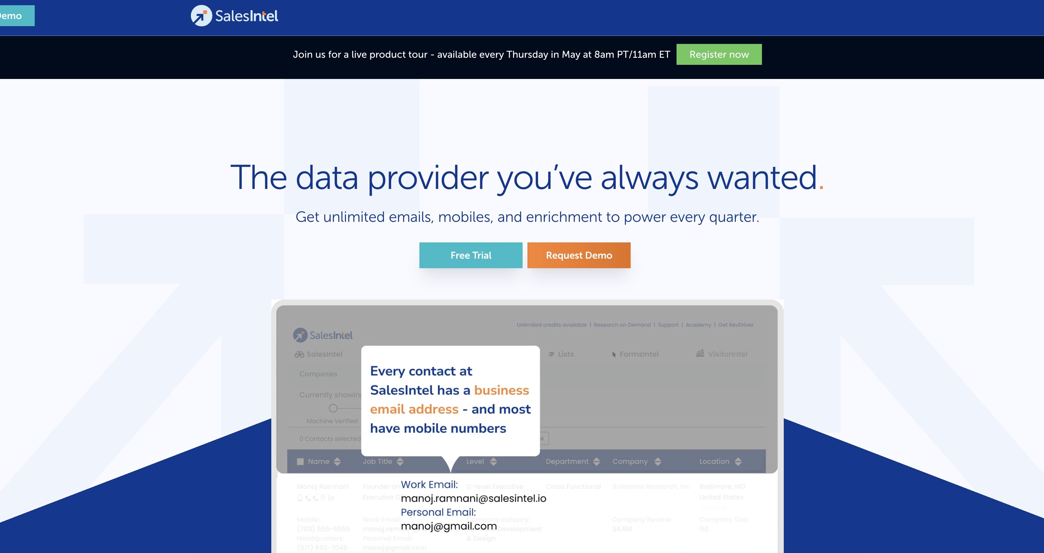 SalesIntel's database includes over 5+ million company profiles and 18+ million decision-maker contacts. They also offer integrations with popular CRMs and sales tools, making it easy to incorporate their data into your existing processes.